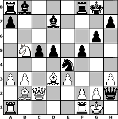 Partie-Notation im PGN-Format [Event "Der HSF feiert 3.Geburtstag-feiert gern mit!"] [Site "www.mySchach.de"] [Date "2013.05.01"] [Round "1"] [White "Stecher1966"] [Black "espero"] [ECO "A80"] [WhitemyELO "1536"] [BlackmyELO "1766"] [Result "0-1"] [TimeControl "10/2592000"] [WhiteDays "30"] [BlackDays "28"] [MySchachNr "88081"] 1. d4 f5 2. e3 Nf6 3. Bc4 d5 4. Bd3 e6 5. Nf3 c5 6. c4 Nc6 7. O-O Bd7 8. a3 b6 9. Nc3 Bd6 10. Qc2 g6 11. h3 Qe7 12. Bd2 O-O 13. Nb5 Bb8 14. cxd5 exd5 15. dxc5 bxc5 16. b3 Ne4 17. Bc1 Ne5 18. Nxe5 Qxe5 19. Bb2 Qh2# 0-1 Stellungs-Notation im FEN-Format rb3rk1/p2b3p/6p1/1Npp1p2/4n3/PP1BP2P/1BQ2PPq/R4RK1 - - - 2 20 Geschlagene Figuren Weiss: Geschlagene Figuren Schwarz: Klicken Sie auf eine geschlagene Figur um den gewünschten Zug darzustellen!