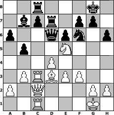 Partie-Notation im PGN-Format [Event "?"] [Site "www.mySchach.de"] [Date "2025.10.04"] [Round "?"] [White "Campino1986"] [Black "peter58"] [ECO "D00"] [WhitemyELO "1558"] [BlackmyELO "1526"] [Result "1/2-1/2"] [TimeControl "10/2592000"] [WhiteDays "81"] [BlackDays "89"] [MySchachNr "133699"] 1. d4 d5 2. e3 Nf6 3. Nf3 e6 4. Be2 Bd6 5. O-O O-O 6. Nc3 Nc6 7. Nb5 Be7 8. c4 dxc4 9. Bxc4 b6 10. b3 Bb7 11. Ba3 a6 12. Bxe7 Nxe7 13. Nc3 b5 14. Bd3 h6 15. Ne5 Ned5 16. Rc1 Nxc3 17. Rxc3 Rc8 18. Qd2 Qd5 19. f3 Qd6 20. Rfc1 Rfe8 21. Qc2 Re7 22. Nc6 Rd7 23. Ne5 1/2-1/2 Stellungs-Notation im FEN-Format 2r3k1/1bpr1pp1/p2qpn1p/1p2N3/3P4/1PRBPP2/P1Q3PP/2R3K1 - - - 8 23 Geschlagene Figuren Weiss: Geschlagene Figuren Schwarz: Klicken Sie auf eine geschlagene Figur um den gewünschten Zug darzustellen!
