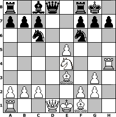 Partie-Notation im PGN-Format [Event "Alapin-Diemer-Gambit Thematurnier"] [Site "www.mySchach.de"] [Date "2010.01.23"] [Round "1"] [White "Lohl"] [Black "muellerh"] [ECO "C01"] [WhitemyELO "1458"] [BlackmyELO "1484"] [Result "1-0"] [TimeControl "10/2592000"] [WhiteDays "47"] [BlackDays "00"] [MySchachNr "62559"] 1. e4 e6 2. d4 d5 3. Be3 dxe4 4. Ne2 Nf6 5. Ng3 Bd6 6. Nd2 Bxg3 7. hxg3 O-O 8. Rh4 Nc6 9. Nxe4 e5 10. dxe5 1-0 Stellungs-Notation im FEN-Format r1bq1rk1/ppp2ppp/2n2n2/4P3/4N2R/4B1P1/PPP2PP1/R2QKB2 - Q - 0 10 Geschlagene Figuren Weiss: Geschlagene Figuren Schwarz: Klicken Sie auf eine geschlagene Figur um den gewünschten Zug darzustellen!