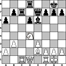 | Partie-Notation im PGN-Format [Event "2. Clubmeisterschaft 2011/12- B-Finale"] [Site "www.mySchach.de"] [Date "2012.02.05"] [Round "1"] [White "Gauss1233"] [Black "morchel"] [ECO "A52"] [WhitemyELO "1356"] [BlackmyELO "1449"] [Result "1-0"] [TimeControl "10/2592000"] [WhiteDays "78"] [BlackDays "88"] [MySchachNr "79687"] 1. d4 Nf6 2. c4 e5 3. dxe5 Ng4 4. Nf3 Nc6 5. Bf4 Bc5 6. e3 Qe7 7. Qd5 Nb4 8. Qd2 Nc6 9. Qd5 d6 10. exd6 Bxd6 11. Bxd6 cxd6 12. Be2 Nf6 13. O-O Be6 14. Qd1 O-O 15. b3 a6 16. Nc3 Rfd8 17. Nd5 Nxd5 18. cxd5 Rac8 19. dxc6 Rxc6 20. Nd4 Rc7 21. Rc1 1-0 Stellungs-Notation im FEN-Format 3r2k1/1pr1qppp/p2pb3/8/3N4/1P2P3/P3BPPP/2RQ1RK1 - - - 3 21 Geschlagene Figuren Weiss:                              Geschlagene Figuren Schwarz:                               Klicken Sie auf eine geschlagene Figur um den gewünschten Zug darzustellen!