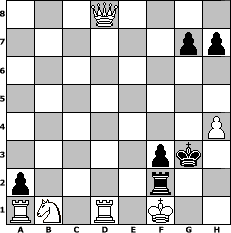 Partie-Notation im PGN-Format [Event "Herbst 2016"] [Site "www.mySchach.de"] [Date "2016.09.13"] [Round "1"] [White "lotchi"] [Black "Joschi"] [ECO "A00"] [WhitemyELO "1231"] [BlackmyELO "1538"] [Result "1/2-1/2"] [TimeControl "10/1728000"] [WhiteDays "104"] [BlackDays "120"] [MySchachNr "104932"] 1. Nc3 d5 2. d4 Nf6 3. Nf3 e6 4. Bg5 c5 5. e3 Nc6 6. dxc5 Bxc5 7. Bxf6 Qxf6 8. Bb5 Bb4 9. Bxc6+ bxc6 10. Qd2 O-O 11. a3 Bxc3 12. bxc3 Ba6 13. h4 Rfb8 14. Qd4 Qe7 15. Ne5 Qc7 16. a4 c5 17. Qf4 f6 18. Nd3 e5 19. Qh2 Qa5 20. Kd2 d4 21. Ra3 dxc3+ 22. Rxc3 Bxd3 23. cxd3 Qxa4 24. Rhc1 Rb2+ 25. Ke1 Qb4 26. Qh3 a5 27. Qd7 a4 28. Qd5+ Kf8 29. Qxa8+ Kf7 30. Qa7+ Kg6 31. Qxc5 Qxc5 32. Rxc5 a3 33. Ra1 a2 34. Rc1 Kf5 35. g3 Kg4 36. d4 exd4 37. exd4 Kf3 38. d5 Rxf2 39. Rc3+ Kg2 40. Rc1 Kxg3 41. Rd1 f5 42. d6 f4 43. d7 f3 44. d8=Q Re2+ 45. Kf1 Rf2+ 46. Ke1 Re2+ 47. Kf1 Rf2+ 48. Kg1 Rg2+ 49. Kh1 Rh2+ 50. Kg1 Rg2+ 51. Kf1 Rf2+ 1/2-1/2 Stellungs-Notation im FEN-Format 3Q4/6pp/8/8/7P/5pk1/p4r2/RN1R1K2 - - - 15 52 Geschlagene Figuren Weiss: Geschlagene Figuren Schwarz: Klicken Sie auf eine geschlagene Figur um den gewünschten Zug darzustellen!