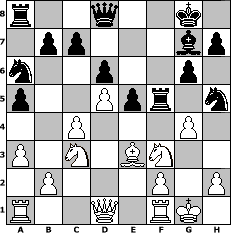 Partie-Notation im PGN-Format [Event "1. Chess Cafe Mannschaftsturnier 2017"] [Site "www.mySchach.de"] [Date "2017.01.29"] [Round "1"] [Board "2"] [White "noma"] [Black "kalle"] [ECO "A10"] [WhitemyELO "1686"] [BlackmyELO "1536"] [Result "1-0"] [TimeControl "10/3456000"] [WhiteDays "40"] [BlackDays "36"] [MySchachNr "106684"] 1. c4 d6 2. d4 Nf6 3. Nf3 g6 4. Nc3 Bg7 5. e4 O-O 6. Be2 e5 7. d5 a5 8. O-O Nh5 9. Bd3 Na6 10. Bc2 Nc5 11. Bg5 f6 12. Be3 Na6 13. a3 f5 14. exf5 Bxf5 15. Bxf5 Rxf5 16. g4 1-0 Stellungs-Notation im FEN-Format r2q2k1/1pp3bp/n2p2p1/p2Ppr1n/2P3P1/P1N1BN2/1P3P1P/R2Q1RK1 - - - 0 16 Geschlagene Figuren Weiss: Geschlagene Figuren Schwarz: Klicken Sie auf eine geschlagene Figur um den gewünschten Zug darzustellen!