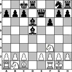 Partie-Notation im PGN-Format [Event "Wanderpokal April"] [Site "www.mySchach.de"] [Date "2006.04.01"] [Round "1"] [White "FreshPrinc2"] [Black "Master1"] [ECO "C21"] [WhitemyELO "1145"] [BlackmyELO "2934"] [Result "0-1"] [TimeControl "10/86400"] [WhiteDays "02"] [BlackDays "02"] [MySchachNr "24138"] 1. e4 e5 2. d4 d6 3. dxe5 Nc6 4. exd6 Bxd6 5. Bb5 Bd7 6. Bxc6 Bxc6 7. Qd2 Bxe4 8. Nf3 Qe7 9. O-O O-O-O 10. Qg5 f6 11. Qd5 Bxd5 0-1 Stellungs-Notation im FEN-Format 2kr2nr/ppp1q1pp/3b1p2/3b4/8/5N2/PPP1PPPP/RNB2RK1 - - - 0 12 Geschlagene Figuren Weiss: ![]() ![]() ![]() ![]() ![]() ![]() ![]() ![]() ![]() ![]() ![]() ![]() ![]() ![]() ![]() Geschlagene Figuren Schwarz: ![]() ![]() ![]() ![]() ![]() ![]() ![]() ![]() ![]() ![]() ![]() ![]() ![]() ![]() ![]() Klicken Sie auf eine geschlagene Figur um den gewünschten Zug darzustellen!