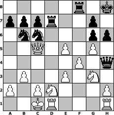 Partie-Notation im PGN-Format [Event "Trainingslager II"] [Site "www.mySchach.de"] [Date "2011.05.24"] [Round "1"] [White "reisender"] [Black "Steppenwolf"] [ECO "D00"] [WhitemyELO "1322"] [BlackmyELO "1115"] [Result "1-0"] [TimeControl "10/1728000"] [WhiteDays "20"] [BlackDays "00"] [MySchachNr "74097"] 1. d4 d5 2. e3 Nf6 3. Bd3 Nc6 4. Ne2 Bg4 5. f3 Bh5 6. g4 Bg6 7. Bxg6 fxg6 8. b3 e5 9. Bb2 Bb4+ 10. Bc3 O-O 11. dxe5 Nd7 12. Qxd5+ Kh8 13. Bxb4 Nxb4 14. Qc4 Nc6 15. f4 Qh4+ 16. Ng3 Nb6 17. Qc5 Rad8 18. g5 h6 19. Nd2 Rd7 20. O-O-O 1-0 Stellungs-Notation im FEN-Format 5r1k/pppr2p1/1nn3pp/2Q1P1P1/5P1q/1P2P1N1/P1PN3P/2KR3R - - - 3 20 Geschlagene Figuren Weiss: Geschlagene Figuren Schwarz: Klicken Sie auf eine geschlagene Figur um den gewünschten Zug darzustellen!