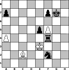 Partie-Notation im PGN-Format [Event "Relax 2009"] [Site "www.mySchach.de"] [Date "2009.05.20"] [Round "1"] [White "Jolilein"] [Black "gambito"] [ECO "A20"] [WhitemyELO "1787"] [BlackmyELO "1500"] [Result "0-1"] [TimeControl "10/3456000"] [WhiteDays "172"] [BlackDays "039"] [MySchachNr "55854"] 1. c4 e5 2. e4 Nc6 3. Nc3 Bc5 4. Nf3 d6 5. Be2 Nf6 6. d3 O-O 7. O-O Nd4 8. Nxd4 Bxd4 9. Qd2 h6 10. Qc2 c6 11. Bf3 Be6 12. Ne2 Bc5 13. Ng3 b5 14. Bd2 bxc4 15. dxc4 Rb8 16. Qc1 Bd4 17. Bxh6 gxh6 18. Qxh6 Rxb2 19. Nf5 Bxf5 20. exf5 Nh7 21. Bxc6 Rb6 22. Be4 Qg5 23. Qxg5+ Nxg5 24. Bd5 Bxa1 25. Rxa1 Rfb8 26. Rf1 Rb1 27. h4 Nh7 28. Bc6 Rxf1+ 29. Kxf1 Rb4 30. g3 Rxc4 31. Bd5 Rc3 32. Bb3 Nf6 33. Ke2 d5 34. g4 Nxg4 35. Bxd5 Nf6 36. Bb3 Rh3 37. Bc2 Rxh4 38. a3 Rh2 39. Bd1 Kg7 40. a4 Ne4 41. Kf3 Rh4 42. Bc2 Rf4+ 43. Ke3 Nxf2 0-1 Stellungs-Notation im FEN-Format 8/p4pk1/8/4pP2/P4r2/4K3/2B2n2/8 - - - 0 44 Geschlagene Figuren Weiss: Geschlagene Figuren Schwarz: Klicken Sie auf eine geschlagene Figur um den gewünschten Zug darzustellen!