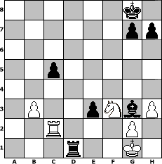 Partie-Notation im PGN-Format [Event "9er10"] [Site "www.mySchach.de"] [Date "2025.11.20"] [Round "1"] [White "faustballer"] [Black "Winston"] [ECO "B20"] [WhitemyELO "1455"] [BlackmyELO "1505"] [Result "0-1"] [TimeControl "10/3456000"] [WhiteDays "40"] [BlackDays "40"] [MySchachNr "133972"] 1. e4 c5 2. b3 e5 3. Bb2 d6 4. h3 a6 5. Nf3 Nf6 6. Bc4 b5 7. Be2 Nxe4 8. Nc3 Nf6 9. Nh2 Be7 10. Bf3 Ra7 11. O-O Nbd7 12. Ne4 Nb6 13. Nxf6+ Bxf6 14. Rb1 O-O 15. Bg4 Bg5 16. Bxc8 Qxc8 17. Bc1 f5 18. d3 Be7 19. Be3 Nd5 20. Qd2 Qe6 21. c4 Nxe3 22. Qxe3 Bf6 23. b4 e4 24. dxe4 Bd4 25. Qe2 fxe4 26. cxb5 axb5 27. bxc5 dxc5 28. Qxb5 Raf7 29. Qb3 Bxf2+ 30. Kh1 Qxb3 31. axb3 e3 32. Rb2 Bg3 33. Rxf7 Rxf7 34. Rc2 Rf5 35. Nf3 Rd5 36. Kg1 Rd1+ 0-1 Stellungs-Notation im FEN-Format 6k1/6pp/8/2p5/8/1P2pNbP/2R3P1/3r2K1 - - - 6 37 Geschlagene Figuren Weiss: Geschlagene Figuren Schwarz: Klicken Sie auf eine geschlagene Figur um den gewünschten Zug darzustellen!