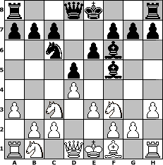 Partie-Notation im PGN-Format [Event "unter uns Nr. 42 (Osterturnier)"] [Site "www.mySchach.de"] [Date "2018.03.22"] [Round "1"] [White "lotchi"] [Black "Master1"] [ECO "A00"] [WhitemyELO "1068"] [BlackmyELO "1263"] [Result "1-0"] [TimeControl "10/864000"] [WhiteDays "08"] [BlackDays "00"] [MySchachNr "111801"] 1. Nc3 d5 2. d4 Nf6 3. Nf3 Bf5 4. Bg5 e6 5. h3 Be7 6. Bxf6 Bxf6 7. e3 Nc6 8. a3 1-0 Stellungs-Notation im FEN-Format r2qk2r/ppp2ppp/2n1pb2/3p1b2/3P4/P1N1PN1P/1PP2PP1/RN1QKB1R - KQkq - 0 8 Geschlagene Figuren Weiss: Geschlagene Figuren Schwarz: Klicken Sie auf eine geschlagene Figur um den gewünschten Zug darzustellen!