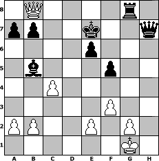 Partie-Notation im PGN-Format [Event "Schachkreis #2"] [Site "www.mySchach.de"] [Date "2018.07.05"] [Round "1"] [White "alibengali"] [Black "sprinterde"] [ECO "C01"] [WhitemyELO "1686"] [BlackmyELO "1710"] [Result "0-1"] [TimeControl "10/2592000"] [WhiteDays "30"] [BlackDays "28"] [MySchachNr "112507"] 1. e4 e6 2. d4 Nf6 3. e5 Nd5 4. c4 Ne7 5. Bd3 d6 6. Nf3 Nbc6 7. O-O dxe5 8. dxe5 Nf5 9. Nc3 Nfd4 10. Bf4 Nxf3+ 11. Qxf3 g5 12. Bg3 h5 13. h3 Bg7 14. Rfe1 g4 15. hxg4 hxg4 16. Qxg4 Bxe5 17. Rxe5 Qxd3 18. Rd1 Qh7 19. f3 Nxe5 20. Bxe5 f5 21. Qg3 Rg8 22. Qf4 Bd7 23. Bxc7 Rc8 24. Nb5 Bxb5 25. Rd8+ Rxd8 26. Bxd8 Kxd8 27. Qb8+ Ke7 0-1 Stellungs-Notation im FEN-Format 1Q4r1/pp2k2q/4p3/1b3p2/2P5/5P2/PP2P1P1/6K1 - - - 2 28 Geschlagene Figuren Weiss: Geschlagene Figuren Schwarz: Klicken Sie auf eine geschlagene Figur um den gewünschten Zug darzustellen!