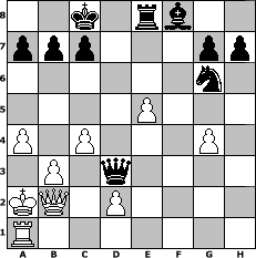 Partie-Notation im PGN-Format [Event "?"] [Site "www.mySchach.de"] [Date "2021.02.17"] [Round "?"] [White "vim"] [Black "Winston"] [Variant "Fischerrandom"] [SetUp "1"] [FEN "rkqrnbbn/pppppppp/8/8/8/8/PPPPPPPP/RKQRNBBN w KQkq - 0 1"] [WhitemyELO "1552"] [BlackmyELO "1542"] [Result "0-1"] [TimeControl "10/1728000"] [WhiteDays "60"] [BlackDays "60"] [MySchachNr "121231"] 1. d4 d5 2. h3 Ng6 3. Bh2 Nd6 4. b3 f6 5. f4 e5 6. fxe5 fxe5 7. dxe5 Ne4 8. Qb2 Re8 9. g4 Qd7 10. Bg2 Qb5 11. Nd3 O-O-O 12. a4 Qc6 13. Nhf2 Nc3+ 14. Kc1 Nxd1 15. Kxd1 Be6 16. e4 dxe4 17. Bxe4 Bd5 18. Bxd5 Rxd5 19. c4 Rxd3+ 20. Nxd3 Qh1+ 21. Kc2 Qxh2+ 22. Kb1 Qxh3 23. Ka2 Qxd3 0-1 Stellungs-Notation im FEN-Format 2k1rb2/ppp3pp/6n1/4P3/P1P3P1/1P1q4/KQ1P4/R7 - - - 0 24 Geschlagene Figuren Weiss: Geschlagene Figuren Schwarz: Klicken Sie auf eine geschlagene Figur um den gewünschten Zug darzustellen!