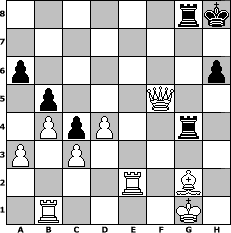 Partie-Notation im PGN-Format [Event "< 1500 Nr. 2"] [Site "www.mySchach.de"] [Date "2010.04.07"] [Round "1"] [White "vento"] [Black "hape50"] [ECO "D00"] [WhitemyELO "1139"] [BlackmyELO "1244"] [Result "1-0"] [TimeControl "10/2592000"] [WhiteDays "29"] [BlackDays "30"] [MySchachNr "64626"] 1. d4 d5 2. e3 a6 3. Nc3 Nf6 4. Bd3 Nc6 5. Nf3 h6 6. Bd2 Bd7 7. O-O e6 8. Re1 Bd6 9. a3 Ne7 10. h3 c5 11. Ne2 O-O 12. b3 b5 13. c3 c4 14. Bc2 Nh7 15. e4 dxe4 16. Nh2 f5 17. Bf4 Bxf4 18. Nxf4 Qc7 19. Qd2 Rf6 20. Re3 Nd5 21. Nxd5 exd5 22. g3 Ng5 23. h4 Nh7 24. Rb1 Nf8 25. Bd1 Ne6 26. Re1 Raf8 27. Nf1 g5 28. f4 exf3 29. Bxf3 gxh4 30. Ne3 Qxg3+ 31. Bg2 h3 32. Re2 Nf4 33. Nf1 Rg6 34. Nxg3 Rxg3 35. Qxf4 Rg4 36. Qf3 Bc6 37. Qxh3 Rf6 38. b4 Rfg6 39. Qf3 Bd7 40. Qxd5+ Kh8 41. Qxd7 Rg8 42. Qxf5 1-0 Stellungs-Notation im FEN-Format 6rk/8/p6p/1p3Q2/1PpP2r1/P1P5/4R1B1/1R4K1 - - - 0 42 Geschlagene Figuren Weiss: Geschlagene Figuren Schwarz: Klicken Sie auf eine geschlagene Figur um den gewünschten Zug darzustellen!