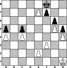 Partie-Notation im PGN-Format [Event "9. Frankenwaldsturnier"] [Site "www.mySchach.de"] [Date "2009.08.21"] [Round "1"] [White "Schefsche"] [Black "bluescreenlover"] [ECO "C21"] [WhitemyELO "1363"] [BlackmyELO "1335"] [Result "1/2-1/2"] [TimeControl "10/864000"] [WhiteDays "28"] [BlackDays "35"] [MySchachNr "58472"] 1. e4 e5 2. d4 d6 3. d5 c5 4. dxc6 Nxc6 5. Bb5 Bd7 6. Bxc6 Bxc6 7. Nc3 Nf6 8. Bg5 Be7 9. Bxf6 Bxf6 10. Nf3 Qb6 11. b3 Qb4 12. Qd2 O-O 13. Nd5 Qxd2+ 14. Nxd2 Bxd5 15. exd5 e4 16. Rd1 Bc3 17. O-O Rfe8 18. Nc4 Rad8 19. a4 h6 20. h3 g6 21. Rb1 Re7 22. Rbd1 Red7 23. f3 e3 24. Nxe3 Bb4 25. Kh1 Re8 26. Ng4 Kg7 27. h4 h5 28. Nf2 a6 29. Ne4 b5 30. Rd4 Bc5 31. Nxc5 dxc5 32. Re4 Kf8 33. Rxe8+ Kxe8 34. c4 bxa4 35. bxa4 Rb7 36. g4 a5 37. g5 Rb4 38. Re1+ Kf8 39. d6 Rb7 40. Re7 Rxe7 41. dxe7+ 1/2-1/2 Stellungs-Notation im FEN-Format 5k2/4Pp2/6p1/p1p3Pp/P1P4P/5P2/4P3/7K - - - 0 41 Geschlagene Figuren Weiss: ![]() ![]() ![]() ![]() ![]() ![]() ![]() ![]() ![]() ![]() ![]() ![]() ![]() ![]() ![]() Geschlagene Figuren Schwarz: ![]() ![]() ![]() ![]() ![]() ![]() ![]() ![]() ![]() ![]() ![]() ![]() ![]() ![]() ![]() Klicken Sie auf eine geschlagene Figur um den gewünschten Zug darzustellen!