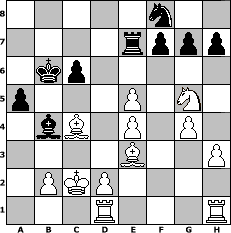 Partie-Notation im PGN-Format [Event "Sweety Tunier"] [Site "www.mySchach.de"] [Date "2006.02.28"] [Round "2"] [White "Robur"] [Black "Falcor"] [ECO "D20"] [WhitemyELO "1721"] [BlackmyELO "1422"] [Result "1-0"] [TimeControl "10/2592000"] [WhiteDays "52"] [BlackDays "49"] [MySchachNr "23010"] 1. d4 d5 2. c4 dxc4 3. e4 e5 4. dxe5 Qxd1+ 5. Kxd1 Bc5 6. f4 Bg4+ 7. Kc2 b5 8. Nc3 Ne7 9. Nxb5 c6 10. Nc7+ Kd7 11. Nxa8 Na6 12. h3 Nb4+ 13. Kc3 Bh5 14. g4 Bg6 15. f5 Rxa8 16. Bxc4 Rd8 17. fxg6 Nxg6 18. Nf3 Kc7 19. a3 a5 20. axb4 Bxb4+ 21. Kc2 Nf8 22. Bf4 Rd7 23. Rad1 Re7 24. Ng5 Kb6 25. Be3+ 1-0 Stellungs-Notation im FEN-Format 5n2/4rppp/1kp5/p3P1N1/1bB1P1P1/4B2P/1PKP4/3R3R - - - 9 25 Geschlagene Figuren Weiss: Geschlagene Figuren Schwarz: Klicken Sie auf eine geschlagene Figur um den gewünschten Zug darzustellen!