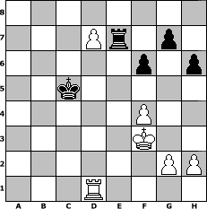 Partie-Notation im PGN-Format [Event "Kellertunier"] [Site "www.mySchach.de"] [Date "2005.08.15"] [Round "1"] [White "Andylein1989"] [Black "Pocket"] [ECO "C60"] [WhitemyELO "1414"] [BlackmyELO "1282"] [Result "1-0"] [TimeControl "10/864000"] [WhiteDays "10"] [BlackDays "10"] [MySchachNr "16253"] 1. e4 e5 2. Nf3 Nc6 3. Bb5 Bd6 4. Bxc6 bxc6 5. d4 Ba6 6. dxe5 Bc5 7. Nc3 Ne7 8. a3 O-O 9. b4 Bb6 10. Na4 Qb8 11. Nxb6 Qxb6 12. Be3 c5 13. Bxc5 Qe6 14. Bxe7 Qxe7 15. Qd2 Rad8 16. O-O-O c5 17. Rhe1 cxb4 18. Qxb4 Qxb4 19. axb4 Bb5 20. Rd5 Rb8 21. Nd4 Bc6 22. Nxc6 dxc6 23. Ra5 Rxb4 24. Rxa7 Rfb8 25. Rc7 h6 26. Rxc6 Rb1+ 27. Kd2 Rd8+ 28. Rd6 Rbb8 29. Rd1 f6 30. Ke2 Rxd6 31. exd6 Rd8 32. c4 Kf7 33. c5 Ke6 34. f4 Kd7 35. e5 Kc6 36. e6 Kxc5 37. e7 Re8 38. d7 Rxe7+ 39. Kf3 1-0 Stellungs-Notation im FEN-Format 8/3Pr1p1/5p1p/2k5/5P2/5K2/6PP/3R4 - - - 1 39 Geschlagene Figuren Weiss: ![]() ![]() ![]() ![]() ![]() ![]() ![]() ![]() ![]() ![]() ![]() ![]() ![]() ![]() ![]() Geschlagene Figuren Schwarz: ![]() ![]() ![]() ![]() ![]() ![]() ![]() ![]() ![]() ![]() ![]() ![]() ![]() ![]() ![]() Klicken Sie auf eine geschlagene Figur um den gewünschten Zug darzustellen!