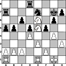 Partie-Notation im PGN-Format [Event "Obs regnet oder schneit-Wir sind zum Schach bereit"] [Site "www.mySchach.de"] [Date "2013.09.21"] [Round "1"] [White "beowulf"] [Black "Wulfen49"] [ECO "A15"] [WhitemyELO "1416"] [BlackmyELO "1311"] [Result "1-0"] [TimeControl "10/1728000"] [WhiteDays "20"] [BlackDays "20"] [MySchachNr "90429"] 1. c4 Nf6 2. d4 d5 3. Nc3 e6 4. Bg5 Be7 5. Nf3 O-O 6. e3 Nc6 7. cxd5 exd5 8. Bb5 Bd7 9. O-O a6 10. Ba4 Bg4 11. h3 Bd7 12. Re1 Nh5 13. Bxe7 Nxe7 14. Bxd7 Qxd7 15. Ne5 Qe6 16. Qxh5 g6 17. Qg4 Qxg4 18. Nxg4 c6 19. Na4 b5 20. Nc5 f5 21. Ne5 a5 22. Ncd7 Rfd8 23. Nc5 Ra7 24. g4 Kg7 25. Ne6+ 1-0 Stellungs-Notation im FEN-Format 3r4/r3n1kp/2p1N1p1/pp1pNp2/3P2P1/4P2P/PPP2P2/R3R1K1 - - - 2 25 Geschlagene Figuren Weiss: Geschlagene Figuren Schwarz: Klicken Sie auf eine geschlagene Figur um den gewünschten Zug darzustellen!