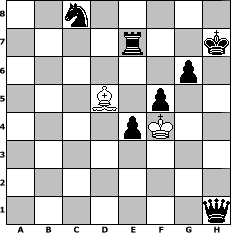 Partie-Notation im PGN-Format [Event "?"] [Site "www.mySchach.de"] [Date "2022.09.18"] [Round "?"] [White "Achimkogge"] [Black "faustballer"] [Variant "Fischerrandom"] [SetUp "1"] [FEN "qnbnrkrb/pppppppp/8/8/8/8/PPPPPPPP/QNBNRKRB w KQkq - 0 1"] [WhitemyELO "1338"] [BlackmyELO "1522"] [Result "0-1"] [TimeControl "10/2592000"] [WhiteDays "180"] [BlackDays "180"] [MySchachNr "127187"] 1. d4 g6 2. Bh6+ Bg7 3. Bxg7+ Rxg7 4. b4 b6 5. Ne3 Bb7 6. f3 h5 7. h4 Ne6 8. O-O-O Nf4 9. Rde1 Ne6 10. d5 Bxd5 11. Nxd5 Qxd5 12. Rd1 Qb5 13. c3 Qxe2 14. Rd2 Qb5 15. a4 Qc6 16. Re1 Kg8 17. c4 Qxc4+ 18. Nc3 Qxb4 19. Re4 Qc5 20. Kd1 c6 21. g3 Qg1+ 22. Re1 Qxg3 23. Ne4 Qxh4 24. Qa3 Qf4 25. a5 b5 26. a6 Qc7 27. Bg2 d5 28. Bf1 dxe4 29. Rxe4 Ng5 30. Red4 Nxf3 31. Qxf3 Nxa6 32. Rd7 Qc8 33. Rxa7 Nc5 34. Bh3 Qb8 35. Qxc6 Ne4 36. Rb7 Qg3 37. Qxe8+ Kh7 38. Bf1 Nxd2 39. Be2 Nc4 40. Rxb5 Nd6 41. Qc8 Nxc8 42. Rb7 e5 43. Rb4 h4 44. Rc4 Qb3+ 45. Rc2 h3 46. Bc4 Qb1+ 47. Kd2 f5 48. Bd5 Qxc2+ 49. Kxc2 e4 50. Kd2 h2 51. Ke3 h1=Q 52. Kf4 Re7 0-1 Stellungs-Notation im FEN-Format 2n5/4r2k/6p1/3B1p2/4pK2/8/8/7q - - - 2 53 Geschlagene Figuren Weiss: Geschlagene Figuren Schwarz: Klicken Sie auf eine geschlagene Figur um den gewünschten Zug darzustellen!