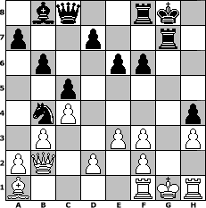 Partie-Notation im PGN-Format [Event "2.MySchach-960-Mannschaftsturnier 2014"] [Site "www.mySchach.de"] [Date "2014.02.18"] [Round "2"] [Board "3"] [White "Winston"] [Black "SibylleSchwerdt"] [Variant "Fischerrandom"] [SetUp "1"] [FEN "bbqnnrkr/pppppppp/8/8/8/8/PPPPPPPP/BBQNNRKR w KQkq - 0 1"] [WhitemyELO "1450"] [BlackmyELO "1587"] [Result "0-1"] [TimeControl "10/3456000"] [WhiteDays "40"] [BlackDays "34"] [MySchachNr "93014"] 1. b3 c5 2. Qb2 h5 3. c4 h4 4. h3 b6 5. Bf5 e6 6. Bg4 Nc6 7. Nf3 f5 8. Ne3 fxg4 9. Nxg4 Nf6 10. Nxf6+ gxf6 11. e3 Rh7 12. Qc2 Nb4 13. Qb2 Bxf3 14. gxf3 Rg7# 0-1 Stellungs-Notation im FEN-Format 1bq2rk1/p2p2r1/1p2pp2/2p5/1nP4p/1P2PP1P/PQ1P1P2/B4RKR - KQq - 1 15 Geschlagene Figuren Weiss: Geschlagene Figuren Schwarz: Klicken Sie auf eine geschlagene Figur um den gewünschten Zug darzustellen!