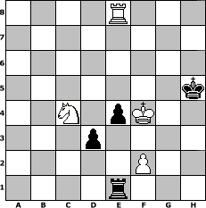 Partie-Notation im PGN-Format [Event "Die Weinlese 2014 m. 50.00 Eu 1.Preis"] [Site "www.mySchach.de"] [Date "2014.09.15"] [Round "1"] [White "espero"] [Black "Helangel"] [ECO "D00"] [WhitemyELO "1738"] [BlackmyELO "1905"] [Result "1-0"] [TimeControl "10/2592000"] [WhiteDays "28"] [BlackDays "05"] [MySchachNr "95933"] 1. d4 d5 2. Bf4 c6 3. e3 Nf6 4. c4 Bf5 5. Nc3 e6 6. Qb3 Qc8 7. Rc1 Be7 8. Nf3 O-O 9. Nh4 Be4 10. Be2 Nbd7 11. O-O h6 12. Nf3 dxc4 13. Qxc4 Bf5 14. h3 Nd5 15. Bh2 Qd8 16. Nd2 Bg6 17. Qb3 Qb6 18. Na4 Qxb3 19. Nxb3 a5 20. Nac5 Nxc5 21. Nxc5 Ra7 22. a3 Rd8 23. Rfd1 h5 24. Bf3 Bg5 25. Kf1 h4 26. Ke2 Kf8 27. g4 hxg3 28. Bxg3 Ke7 29. h4 Bh6 30. Rg1 Rg8 31. Be5 Bh7 32. Be4 Bxe4 33. Nxe4 f6 34. Bd6+ Kd7 35. Bh2 Ke7 36. Rg6 Rd8 37. b3 Kf7 38. h5 Ne7 39. Rgg1 Nf5 40. Rc5 Rd5 41. a4 Rd7 42. Rb1 Ra8 43. Rc4 g6 44. b4 gxh5 45. Nc5 b5 46. Nxd7 bxc4 47. Nb6 Ra6 48. Nxc4 axb4 49. Rxb4 c5 50. Rb7+ Kg6 51. a5 cxd4 52. e4 Ng7 53. Rb6 Ra8 54. Bg3 Bg5 55. a6 h4 56. Bb8 Nh5 57. Kf3 h3 58. Kg4 Bf4 59. Bxf4 Nxf4 60. Kxf4 h2 61. Rb1 Rxa6 62. Kf3 Kg5 63. Rh1 Ra4 64. Nb6 Ra3+ 65. Kg2 Rc3 66. Rxh2 Rc6 67. Nd7 d3 68. Rh1 Kf4 69. Rd1 Kxe4 70. Nxf6+ Kd4 71. Ng4 Ra6 72. Ne3 e5 73. Kf1 Ke4 74. Rb1 Kf3 75. Nc4 e4 76. Nd2+ Kf4 77. Rb8 Ra5 78. Nc4 Rc5 79. Rf8+ Rf5 80. Rh8 Kg5 81. Nd6 Rf4 82. Ke1 Kg6 83. Rg8+ Kh5 84. Nc4 Rg4 85. Rf8 Rg6 86. Re8 Rg1+ 87. Kd2 Rf1 88. Ke3 Re1+ 89. Kf4 1-0 Stellungs-Notation im FEN-Format 4R3/8/8/7k/2N1pK2/3p4/5P2/4r3 - - - 27 89 Geschlagene Figuren Weiss: Geschlagene Figuren Schwarz: Klicken Sie auf eine geschlagene Figur um den gewünschten Zug darzustellen!