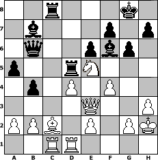 Partie-Notation im PGN-Format [Event "Fr"] [Site "www.mySchach.de"] [Date "2008.03.06"] [Round "1"] [White "Helmut48"] [Black "Joschi"] [ECO "B17"] [WhitemyELO "1368"] [BlackmyELO "1596"] [Result "1/2-1/2"] [TimeControl "10/1728000"] [WhiteDays "59"] [BlackDays "57"] [MySchachNr "43191"] 1. e4 c6 2. d4 d5 3. Nc3 dxe4 4. Nxe4 Nd7 5. Bc4 Ngf6 6. Nxf6+ Nxf6 7. h3 e6 8. Bg5 Be7 9. Nf3 O-O 10. Bxf6 Bxf6 11. O-O b5 12. Bb3 a5 13. c3 Bb7 14. Re1 Qc7 15. Ne5 c5 16. Bc2 cxd4 17. cxd4 Rad8 18. Qd3 g6 19. Rad1 b4 20. f4 Rc8 21. Rc1 Qb6 22. Red1 Rfd8 23. Kh2 Rd5 24. Qe3 1/2-1/2 Stellungs-Notation im FEN-Format 2r3k1/1b3p1p/1q2pbp1/p2rN3/1p1P1P2/4Q2P/PPB1P1PK/2RR4 - - - 8 24 Geschlagene Figuren Weiss: Geschlagene Figuren Schwarz: Klicken Sie auf eine geschlagene Figur um den gewünschten Zug darzustellen!
