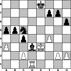 | Partie-Notation im PGN-Format [Event "9erD2"] [Site "www.mySchach.de"] [Date "2011.09.01"] [Round "1"] [White "amsoft"] [Black "nogumo"] [ECO "A18"] [WhitemyELO "1573"] [BlackmyELO "1689"] [Result "0-1"] [TimeControl "10/3456000"] [WhiteDays "00"] [BlackDays "37"] [MySchachNr "76021"] 1. c4 Nf6 2. Nc3 e6 3. e4 Bb4 4. d3 O-O 5. Nf3 h6 6. Be2 b6 7. O-O Bb7 8. a3 Bxc3 9. bxc3 c5 10. Bf4 d5 11. cxd5 exd5 12. exd5 Nxd5 13. Qd2 Nd7 14. Rfe1 Qf6 15. Bg3 Nxc3 16. Bh4 Nxe2+ 17. Qxe2 Bxf3 18. Bxf6 Bxe2 19. Be7 Bxd3 20. Bxf8 Kxf8 21. Rad1 c4 22. Re3 Re8 23. Rxe8+ Kxe8 24. f4 Nc5 25. Kf2 b5 26. Ke3 a5 0-1 Stellungs-Notation im FEN-Format 4k3/5pp1/7p/ppn5/2p2P2/P2bK3/2P3PP/3R4 - - - 0 27 Geschlagene Figuren Weiss:                              Geschlagene Figuren Schwarz:                               Klicken Sie auf eine geschlagene Figur um den gewünschten Zug darzustellen!