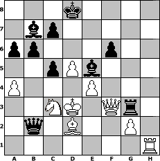 Partie-Notation im PGN-Format [Event "Anderssen-Club-Meisterschaft"] [Site "www.mySchach.de"] [Date "2006.04.11"] [Round "1"] [White "skifahrer"] [Black "rikilatic"] [ECO "A02"] [WhitemyELO "1538"] [BlackmyELO "1568"] [Result "0-1"] [TimeControl "10/864000"] [WhiteDays "10"] [BlackDays "10"] [MySchachNr "24429"] 1. f4 b6 2. Nf3 Bb7 3. e3 e6 4. d4 Nf6 5. Bd3 Nc6 6. O-O Ng4 7. Ng5 h5 8. Bh7 Qe7 9. Be4 O-O-O 10. Bf3 f6 11. Nh3 g5 12. Nc3 Qd6 13. Nb5 Qb4 14. a4 a6 15. Bd2 Qe7 16. Bxc6 dxc6 17. Nc3 Qg7 18. fxg5 Be7 19. Nf4 Qg8 20. h3 Qxg5 21. Nxe6 Qg6 22. Nxd8 Kxd8 23. Rf4 Bd6 24. Rf3 Bh2+ 25. Kf1 c5 26. d5 Be5 27. hxg4 hxg4 28. Kf2 gxf3 29. Qxf3 Qxc2 30. Rd1 Qxb2 31. e4 Bd4+ 32. Ke2 Rg8 33. Kd3 Be5 34. Rh1 Rg3 0-1 Stellungs-Notation im FEN-Format 3k4/1bp5/pp3p2/2pPb3/P3P3/2NK1Qr1/1q1B2P1/7R - - - 7 35 Geschlagene Figuren Weiss: ![]() ![]() ![]() ![]() ![]() ![]() ![]() ![]() ![]() ![]() ![]() ![]() ![]() ![]() ![]() Geschlagene Figuren Schwarz: ![]() ![]() ![]() ![]() ![]() ![]() ![]() ![]() ![]() ![]() ![]() ![]() ![]() ![]() ![]() Klicken Sie auf eine geschlagene Figur um den gewünschten Zug darzustellen!