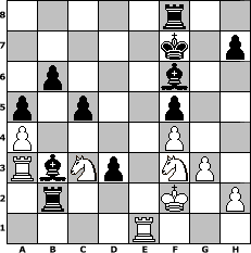 Partie-Notation im PGN-Format [Event "Clubmeisterschaft"] [Site "www.mySchach.de"] [Date "2014.01.19"] [Round "1"] [White "martinus"] [Black "HenrySchinasky"] [ECO "E60"] [WhitemyELO "1788"] [BlackmyELO "2131"] [Result "0-1"] [TimeControl "10/2592000"] [WhiteDays "107"] [BlackDays "108"] [MySchachNr "92419"] 1. d4 Nf6 2. c4 g6 3. Nf3 Bg7 4. Nc3 O-O 5. e4 d6 6. Be2 e5 7. d5 a5 8. a4 Na6 9. O-O Nd7 10. Be3 Ndc5 11. Nd2 Qh4 12. Bf3 f5 13. g3 Qe7 14. exf5 gxf5 15. Bxc5 dxc5 16. Nb3 Nb4 17. Qd2 e4 18. Rfe1 b6 19. Bg2 Qf6 20. d6 cxd6 21. Red1 Be6 22. Qxd6 Bxc4 23. Qxf6 Bxf6 24. Nd2 Bd3 25. Bf1 Bc2 26. Re1 Rad8 27. Nc4 Nd3 28. Bxd3 exd3 29. Nd2 Kf7 30. f4 Rd4 31. Kf2 Rb4 32. Nf3 Rxb2 33. Ra3 Bb3+ 0-1 Stellungs-Notation im FEN-Format 5r2/5k1p/1p3b2/p1p2p2/P4P2/RbNp1NP1/1r3K1P/4R3 - - - 2 34 Geschlagene Figuren Weiss: Geschlagene Figuren Schwarz: Klicken Sie auf eine geschlagene Figur um den gewünschten Zug darzustellen!