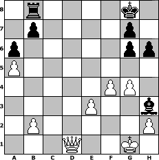 Partie-Notation im PGN-Format [Event "Sommer 2019"] [Site "www.mySchach.de"] [Date "2019.07.17"] [Round "1"] [White "lotchi"] [Black "UPS"] [ECO "A06"] [WhitemyELO "1017"] [BlackmyELO "1674"] [Result "1-0"] [TimeControl "10/2592000"] [WhiteDays "120"] [BlackDays "054"] [MySchachNr "115416"] 1. Nf3 d5 2. d4 Nf6 3. Nc3 e6 4. Bg5 Be7 5. e3 a6 6. Bd3 h6 7. Bxf6 Bxf6 8. a4 Nc6 9. O-O O-O 10. Qd2 e5 11. dxe5 Nxe5 12. Nxe5 Bxe5 13. f4 Bf6 14. Be2 c6 15. a5 Qe7 16. g3 Qb4 17. Rfd1 Bxc3 18. Qxc3 Qe7 19. Qa3 Qe4 20. Rd4 Qg6 21. c4 Bh3 22. cxd5 cxd5 23. Bf3 Rad8 24. Qb3 Rd7 25. Bxd5 Rfd8 26. Rad1 Rb8 27. Be4 Rxd4 28. Bxg6 Rxd1+ 29. Qxd1 fxg6 30. g4 1-0 Stellungs-Notation im FEN-Format 1r4k1/1p4p1/p5pp/P7/5PP1/4P2b/1P5P/3Q2K1 - - - 0 30 Geschlagene Figuren Weiss: Geschlagene Figuren Schwarz: Klicken Sie auf eine geschlagene Figur um den gewünschten Zug darzustellen!