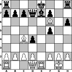 Partie-Notation im PGN-Format [Event "BDG 2"] [Site "www.mySchach.de"] [Date "2015.01.11"] [Round "1"] [White "kalle"] [Black "Mattheus"] [ECO "D00"] [WhitemyELO "1582"] [BlackmyELO "1216"] [Result "1-0"] [TimeControl "10/2592000"] [WhiteDays "57"] [BlackDays "60"] [MySchachNr "97626"] 1. d4 d5 2. e4 dxe4 3. Nc3 e5 4. Nxe4 exd4 5. Nf3 Nc6 6. Bc4 h6 7. O-O Bf5 8. Re1 Be7 9. Ng3 g6 10. Nxf5 gxf5 11. Bf4 Nf6 12. Ne5 Nxe5 13. Bxe5 Qd7 14. Bxf6 1-0 Stellungs-Notation im FEN-Format r3k2r/pppqbp2/5B1p/5p2/2Bp4/8/PPPP1PPP/R2QR1K1 - kq - 0 14 Geschlagene Figuren Weiss: Geschlagene Figuren Schwarz: Klicken Sie auf eine geschlagene Figur um den gewünschten Zug darzustellen!