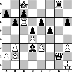 Partie-Notation im PGN-Format [Event "Sweety Tunier"] [Site "www.mySchach.de"] [Date "2006.02.28"] [Round "1"] [White "icke"] [Black "Falcor"] [ECO "D00"] [WhitemyELO "1355"] [BlackmyELO "1422"] [Result "0-1"] [TimeControl "10/2592000"] [WhiteDays "113"] [BlackDays "101"] [MySchachNr "22950"] 1. d4 d5 2. e3 Nf6 3. Qf3 Nc6 4. Nc3 e6 5. Nh3 Bb4 6. Bd2 Bxc3 7. Bxc3 h6 8. Bb5 Qd6 9. Bxc6+ Qxc6 10. Nf4 Ne4 11. O-O b6 12. Bb4 Ba6 13. c4 Bxc4 14. Rfc1 Qb5 15. Ba3 O-O-O 16. h3 g5 17. Be7 Rd7 18. Ba3 gxf4 19. Qxf4 f5 20. b3 Be2 21. Rc2 Bd3 22. Rcc1 Be2 23. Rc2 Bd3 24. Qe5 Re8 25. Rcc1 Qa5 26. Bb2 Qd2 27. Qf4 Rg8 28. Rc6 Rdg7 29. Qh2 Qxf2+ 30. Kh1 Ng3+ 31. Qxg3 Rxg3 32. Rg1 Rxg2 33. Rxg2 Qxg2# 0-1 Stellungs-Notation im FEN-Format 2k3r1/p1p5/1pR1p2p/3p1p2/3P4/1P1bP2P/PB4q1/7K - - - 0 34 Geschlagene Figuren Weiss: Geschlagene Figuren Schwarz: Klicken Sie auf eine geschlagene Figur um den gewünschten Zug darzustellen!