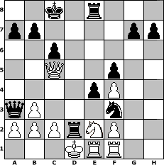 Partie-Notation im PGN-Format [Event "Test the Best"] [Site "www.mySchach.de"] [Date "2006.03.18"] [Round "1"] [White "FreshPrinc2"] [Black "Master1"] [ECO "A01"] [WhitemyELO "1282"] [BlackmyELO "3071"] [Result "0-1"] [TimeControl "10/86400"] [WhiteDays "01"] [BlackDays "01"] [MySchachNr "23701"] 1. b3 Nc6 2. Ba3 Nf6 3. Nc3 d6 4. e4 e6 5. Qf3 Nd4 6. Qd3 e5 7. O-O-O d5 8. Bxf8 Rxf8 9. Nf3 Bg4 10. Be2 Bxf3 11. Bxf3 dxe4 12. Bxe4 Ng4 13. Rdf1 c6 14. Rhg1 f5 15. Bf3 Nxh2 16. Re1 Nhxf3 17. gxf3 Qe7 18. Rgf1 O-O-O 19. Qe3 Rfe8 20. f4 e4 21. Ne2 Qa3+ 22. Kd1 Nf3 23. Qc5 Rxd2# 0-1 Stellungs-Notation im FEN-Format 2k1r3/pp4pp/2p5/2Q2p2/4pP2/qP3n2/PPPrNP2/3KRR2 - - - 0 24 Geschlagene Figuren Weiss: Geschlagene Figuren Schwarz: Klicken Sie auf eine geschlagene Figur um den gewünschten Zug darzustellen!
