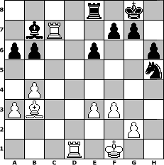 Partie-Notation im PGN-Format [Event "2016"] [Site "www.mySchach.de"] [Date "2016.01.01"] [Round "1"] [White "FrankB"] [Black "Andylein1989"] [ECO "D05"] [WhitemyELO "1669"] [BlackmyELO "1497"] [Result "1-0"] [TimeControl "10/2592000"] [WhiteDays "30"] [BlackDays "28"] [MySchachNr "101948"] 1. d4 d5 2. Nf3 Nf6 3. e3 e6 4. c4 Be7 5. Nc3 O-O 6. Be2 b6 7. O-O Bb7 8. Bd2 dxc4 9. Bxc4 c5 10. a3 Nc6 11. dxc5 Bxc5 12. b4 Bd6 13. Qe2 Ne5 14. Nxe5 Bxe5 15. Rac1 Rc8 16. Rfd1 Qc7 17. Nb5 Qc6 18. f3 a6 19. Na7 Bxh2+ 20. Kf1 Qa4 21. Nxc8 Rxc8 22. Qd3 Re8 23. Be1 Be5 24. Bc3 Bxc3 25. Qxc3 Nh5 26. Qb3 Qxb3 27. Bxb3 h6 28. Rc7 1-0 Stellungs-Notation im FEN-Format 4r1k1/1bR2pp1/pp2p2p/7n/1P6/PB2PP2/6P1/3R1K2 - - - 1 28 Geschlagene Figuren Weiss: Geschlagene Figuren Schwarz: Klicken Sie auf eine geschlagene Figur um den gewünschten Zug darzustellen!