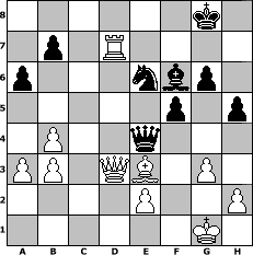 Partie-Notation im PGN-Format [Event "Karnevalsstress"] [Site "www.mySchach.de"] [Date "2009.02.15"] [Round "1"] [White "kischok46"] [Black "edudoc32"] [ECO "B33"] [WhitemyELO "2031"] [BlackmyELO "1804"] [Result "1-0"] [TimeControl "10/1728000"] [WhiteDays "80"] [BlackDays "80"] [MySchachNr "52780"] 1. e4 c5 2. Nf3 Nc6 3. d4 cxd4 4. Nxd4 Nf6 5. Nc3 Qa5 6. Nb3 Qc7 7. Bd3 e6 8. a3 d5 9. exd5 Nxd5 10. Nxd5 exd5 11. O-O Be7 12. Re1 O-O 13. Qh5 g6 14. Qxd5 Bd6 15. Kh1 Be6 16. Qg5 Bxb3 17. cxb3 Qb6 18. Bd2 Qxf2 19. Rad1 Qc5 20. Qh4 Be5 21. Be3 Qd6 22. b4 Bf6 23. Qf2 Rad8 24. Bf1 Nd4 25. Rd3 Rfe8 26. Red1 Re4 27. g3 Qe5 28. Bg2 Ne6 29. Rxd8+ Bxd8 30. Bxe4 Qxe4+ 31. Kg1 a6 32. Rd7 f5 33. Qd2 Bf6 34. b3 h5 35. Qd3 1-0 Stellungs-Notation im FEN-Format 6k1/1p1R4/p3nbp1/5p1p/1P2q3/PP1QB1P1/4P2P/6K1 - - - 1 35 Geschlagene Figuren Weiss: Geschlagene Figuren Schwarz: Klicken Sie auf eine geschlagene Figur um den gewünschten Zug darzustellen!