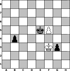 Partie-Notation im PGN-Format [Event "Fr"] [Site "www.mySchach.de"] [Date "2012.03.14"] [Round "1"] [White "Lemmi11"] [Black "pepo47"] [ECO "A45"] [WhitemyELO "1834"] [BlackmyELO "1991"] [Result "0-1"] [TimeControl "10/2592000"] [WhiteDays "28"] [BlackDays "29"] [MySchachNr "80628"] 1. d4 Nf6 2. Nc3 d5 3. Bf4 Bf5 4. e3 e6 5. Nf3 Bb4 6. Bd3 Ne4 7. O-O Nc6 8. Nb5 Ba5 9. Ne5 Nxe5 10. dxe5 g5 11. Bg3 h5 12. h3 Qe7 13. Qe2 g4 14. h4 a6 15. Nd4 Nxg3 16. fxg3 Bxd3 17. cxd3 c5 18. Nb3 Bc7 19. d4 c4 20. Nd2 f5 21. exf6 Qd6 22. Rf4 O-O-O 23. b3 e5 24. dxe5 Qxe5 25. Re1 Qe6 26. bxc4 Bxf4 27. gxf4 Rhf8 28. e4 Qxf6 29. cxd5 Qxf4 30. Rb1 Kb8 31. Qxa6 Qf2+ 32. Kh1 Rd7 33. Qa3 Qxh4+ 34. Kg1 Qf2+ 35. Kh1 Rff7 36. Qb2 g3 37. Qh8+ Rf8 38. Qe5+ Rc7 39. Rc1 Qf4 40. Qxf4 Rxf4 41. Re1 Rc2 42. Nf3 h4 43. d6 h3 44. d7 Kc7 45. Rd1 Kd8 46. Nd4 Rf1+ 47. Rxf1 hxg2+ 48. Kg1 gxf1=Q+ 49. Kxf1 Rxa2 50. Kg1 Kxd7 51. Kh1 Rd2 52. Nb3 Rh2+ 53. Kg1 Kd6 54. Nd4 Rf2 55. Nf5+ Rxf5 56. exf5 b5 57. Kg2 b4 58. Kf3 Ke5 0-1 Stellungs-Notation im FEN-Format 8/8/8/4kP2/1p6/5Kp1/8/8 - - - 2 59 Geschlagene Figuren Weiss: Geschlagene Figuren Schwarz: Klicken Sie auf eine geschlagene Figur um den gewünschten Zug darzustellen!