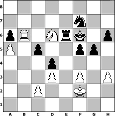 Partie-Notation im PGN-Format [Event "D.A. - Schnell 1"] [Site "www.mySchach.de"] [Date "2008.06.09"] [Round "1"] [White "BobbyF4"] [Black "brucybabe"] [ECO "B21"] [WhitemyELO "1553"] [BlackmyELO "1629"] [Result "1/2-1/2"] [TimeControl "10/864000"] [WhiteDays "09"] [BlackDays "10"] [MySchachNr "45494"] 1. e4 c5 2. f4 d6 3. Nc3 Nc6 4. Bc4 Nf6 5. Nf3 e6 6. O-O a6 7. a4 d5 8. exd5 exd5 9. Re1+ Be7 10. Be2 d4 11. Na2 O-O 12. Ng5 h6 13. Nf3 Re8 14. Bc4 Bd6 15. d3 Rxe1+ 16. Qxe1 Bg4 17. Qg3 Bxf3 18. gxf3 Qc7 19. Qh4 Re8 20. Kf2 Qe7 21. Kg2 Qe2+ 22. Qf2 Nh5 23. Bd5 Bxf4 24. Be4 Qxf2+ 25. Kxf2 Be3+ 26. Kf1 Bxc1 27. Nxc1 Nf6 28. Bxc6 bxc6 29. Nb3 Nd7 30. Kf2 g5 31. Nd2 f5 32. h3 Kf7 33. Nc4 Re6 34. a5 Kf6 35. Rb1 Ne5 36. b3 Ng6 37. b4 cxb4 38. Rxb4 c5 39. Rb6 Ne5 40. Nd6 Nf7 41. Nc4 Nd8 42. Nd6 Nf7 1/2-1/2 Stellungs-Notation im FEN-Format 8/5n2/pR1Nrk1p/P1p2pp1/3p4/3P1P1P/2P2K2/8 - - - 8 43 Geschlagene Figuren Weiss: Geschlagene Figuren Schwarz: Klicken Sie auf eine geschlagene Figur um den gewünschten Zug darzustellen!