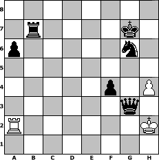 Partie-Notation im PGN-Format [Event "Sweschnikow III"] [Site "www.mySchach.de"] [Date "2012.09.05"] [Round "1"] [White "Achimkogge"] [Black "Steffi"] [ECO "B33"] [WhitemyELO "1447"] [BlackmyELO "1618"] [Result "0-1"] [TimeControl "10/1728000"] [WhiteDays "19"] [BlackDays "20"] [MySchachNr "83733"] 1. e4 c5 2. Nf3 Nc6 3. d4 cxd4 4. Nxd4 Nf6 5. Nc3 e5 6. Nb3 Bb4 7. a3 Bxc3+ 8. bxc3 Nxe4 9. Qf3 Nf6 10. Bd3 d5 11. Bf5 Bxf5 12. Qxf5 Qd7 13. Qxd7+ Nxd7 14. O-O O-O 15. Re1 Rac8 16. Be3 Rfe8 17. f3 f5 18. Bg5 h6 19. Bh4 g5 20. Bf2 f4 21. h3 a6 22. a4 e4 23. fxe4 dxe4 24. Re2 e3 25. Be1 Ne7 26. Nd4 Nc5 27. c4 Nd7 28. Bb4 Rxc4 29. c3 Nd5 30. Nf5 Nxc3 31. Nxh6+ Kh7 32. Bxc3 Rxc3 33. Nf5 Re5 34. Nd6 b6 35. Nf7 Ra5 36. Nxg5+ Rxg5 37. Kh2 Ra5 38. Rf1 Rxa4 39. Rd1 Ne5 40. Rd5 Rc5 41. Rd6 b5 42. Re6 Ng6 43. Rd6 Rc7 44. Rb2 Re7 45. Re2 Rb7 46. Rd5 b4 47. Rh5+ Kg7 48. h4 b3 49. Rb2 Ra2 50. Rxa2 bxa2 51. Ra5 e2 52. Rxa2 e1=Q 53. g3 Qxg3+ 0-1 Stellungs-Notation im FEN-Format 8/1r4k1/p5n1/8/5p1P/6q1/R6K/8 - - - 0 54 Geschlagene Figuren Weiss: Geschlagene Figuren Schwarz: Klicken Sie auf eine geschlagene Figur um den gewünschten Zug darzustellen!
