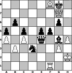 Partie-Notation im PGN-Format [Event "unter uns Nr. 15, Weihnachtsturnier"] [Site "www.mySchach.de"] [Date "2013.12.24"] [Round "1"] [White "Hobbykegler"] [Black "borsti"] [ECO "A20"] [WhitemyELO "1005"] [BlackmyELO "1269"] [Result "1-0"] [TimeControl "10/864000"] [WhiteDays "12"] [BlackDays "40"] [MySchachNr "91788"] 1. c4 e5 2. b3 Bb4 3. Nc3 Bxc3 4. dxc3 d6 5. Qc2 h6 6. Nf3 Nc6 7. g3 Nf6 8. Be3 g6 9. Bg2 O-O 10. O-O Bf5 11. Qd2 Ne4 12. Qd1 Qd7 13. Qd5 Nxc3 14. Qd2 Ne4 15. Qb2 a5 16. a4 Nb4 17. Rad1 b6 18. Bxh6 Rfe8 19. Ng5 Nxg5 20. Bxg5 c5 21. Bh6 Qe7 22. Bxa8 Rxa8 23. h4 Rd8 24. f3 f6 25. e4 Be6 26. f4 Bg4 27. Rd2 Kh7 28. fxe5 dxe5 29. Be3 Rd3 30. Rxd3 Nxd3 31. Qd2 Qd7 32. Bh6 Qd4+ 33. Kh2 Qxe4 34. Bf8 f5 35. Qh6+ Kg8 36. Qg7# 1-0 Stellungs-Notation im FEN-Format 5Bk1/6Q1/1p4p1/p1p1pp2/P1P1q1bP/1P1n2P1/7K/5R2 - - - 3 36 Geschlagene Figuren Weiss: Geschlagene Figuren Schwarz: Klicken Sie auf eine geschlagene Figur um den gewünschten Zug darzustellen!