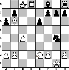 Partie-Notation im PGN-Format [Event "Aufs neue Jahr!!!"] [Site "www.mySchach.de"] [Date "2016.01.06"] [Round "1"] [White "Steffi"] [Black "Schefsche"] [ECO "D06"] [WhitemyELO "1564"] [BlackmyELO "1505"] [Result "1-0"] [TimeControl "10/2592000"] [WhiteDays "37"] [BlackDays "56"] [MySchachNr "102014"] 1. d4 d5 2. c4 c5 3. dxc5 d4 4. Nf3 Nc6 5. e3 Qa5+ 6. Bd2 Qxc5 7. exd4 Nxd4 8. Nxd4 Qxd4 9. Nc3 Nf6 10. Be2 Bg4 11. O-O O-O-O 12. Be3 Qxd1 13. Raxd1 Rxd1 14. Rxd1 Bxe2 15. Nxe2 a6 16. g4 Nxg4 17. Bb6 e6 18. Rd8# 1-0 Stellungs-Notation im FEN-Format 2kR1b1r/1p3ppp/pB2p3/8/2P3n1/8/PP2NP1P/6K1 - - - 1 18 Geschlagene Figuren Weiss: Geschlagene Figuren Schwarz: Klicken Sie auf eine geschlagene Figur um den gewünschten Zug darzustellen!