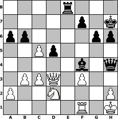 Partie-Notation im PGN-Format [Event "Ja, is denn heut scho Weihnachten?"] [Site "www.mySchach.de"] [Date "2014.12.06"] [Round "1"] [White "freizeitspieler"] [Black "Wernburger"] [ECO "B21"] [WhitemyELO "1582"] [BlackmyELO "1835"] [Result "0-1"] [TimeControl "10/2592000"] [WhiteDays "119"] [BlackDays "120"] [MySchachNr "97064"] 1. e4 c5 2. f4 e6 3. Nf3 Nc6 4. Bc4 d5 5. exd5 exd5 6. Qe2+ Be7 7. Bb5 Bd7 8. O-O a6 9. Bxc6 Bxc6 10. d3 Nf6 11. Re1 Bd7 12. b3 Be6 13. Ng5 Bg4 14. Qe5 h6 15. Nf3 Bxf3 16. gxf3 Kf8 17. Bb2 Qd7 18. f5 Bd6 19. Qe2 Re8 20. Qf2 Rxe1+ 21. Qxe1 Qxf5 22. Qf2 Qg5+ 23. Kh1 Qf4 24. Bxf6 Qxf6 25. c3 Kg8 26. d4 b6 27. Nd2 Kh7 28. Qe3 Bf4 29. Qd3+ g6 30. Rf1 Re8 31. dxc5 Qh4 0-1 Stellungs-Notation im FEN-Format 4r3/5p1k/pp4pp/2Pp4/5b1q/1PPQ1P2/P2N3P/5R1K - - - 1 32 Geschlagene Figuren Weiss: Geschlagene Figuren Schwarz: Klicken Sie auf eine geschlagene Figur um den gewünschten Zug darzustellen!