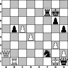 Partie-Notation im PGN-Format [Event "Schach in den Mai"] [Site "www.mySchach.de"] [Date "2008.04.26"] [Round "1"] [White "Andylein1989"] [Black "rux"] [ECO "A00"] [WhitemyELO "1411"] [BlackmyELO "1374"] [Result "0-1"] [TimeControl "10/864000"] [WhiteDays "48"] [BlackDays "50"] [MySchachNr "44521"] 1. c3 e5 2. d4 e4 3. Bf4 d5 4. e3 c6 5. Be2 Bd6 6. Bxd6 Qxd6 7. Bg4 f5 8. Bh5+ g6 9. Be2 b5 10. a4 Bd7 11. axb5 cxb5 12. Qb3 a6 13. Na3 Bc6 14. Nh3 Nf6 15. Nf4 O-O 16. O-O Ne8 17. Nc2 Nc7 18. f3 Re8 19. fxe4 fxe4 20. Nb4 Bb7 21. Bg4 a5 22. Nbd3 exd3 23. Nxd3 Rxe3 24. Nc5 Bc6 25. Qc2 Nba6 26. Rxa5 Nxc5 27. Rxa8+ Bxa8 28. dxc5 Qe7 29. b4 d4 30. cxd4 Bd5 31. Qf2 Bc4 32. Ra1 h5 33. Bf3 Bd5 34. Bxd5+ Nxd5 35. Rb1 Nxb4 36. Kf1 Nd3 37. Qd2 Qg5 38. Qa2+ Kg7 39. g3 Rf3+ 40. Kg1 Qe3+ 41. Kh1 Rf2 42. Qa7+ Rf7 43. Qa2 Nf2+ 44. Kg2 Qf3+ 45. Kg1 Qh1# 0-1 Stellungs-Notation im FEN-Format 8/5rk1/6p1/1pP4p/3P4/6P1/Q4n1P/1R4Kq - - - 13 46 Geschlagene Figuren Weiss: Geschlagene Figuren Schwarz: Klicken Sie auf eine geschlagene Figur um den gewünschten Zug darzustellen!