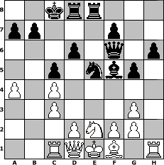 Partie-Notation im PGN-Format [Event ""Freibier f"] [Site "www.mySchach.de"] [Date "2005.05.27"] [Round "1"] [White "Knight"] [Black "Hondo"] [ECO "E30"] [WhitemyELO "1193"] [BlackmyELO "1930"] [Result "0-1"] [TimeControl "10/1728000"] [WhiteDays "40"] [BlackDays "40"] [MySchachNr "13634"] 1. d4 Nf6 2. c4 e6 3. Nc3 Bb4 4. Bg5 c5 5. d5 d6 6. e4 Bxc3+ 7. bxc3 h6 8. Bh4 g5 9. Bg3 Nxe4 10. dxe6 Bxe6 11. Qa4+ Nc6 12. Ne2 Qf6 13. Rc1 O-O-O 14. Qc2 Bf5 15. Qd1 Rhe8 16. a4 Nxg3 17. hxg3 Ne5 0-1 Stellungs-Notation im FEN-Format 2krr3/pp3p2/3p1q1p/2p1nbp1/P1P5/2P3P1/3PNPP1/2RQKB1R - K - 1 18 Geschlagene Figuren Weiss: Geschlagene Figuren Schwarz: Klicken Sie auf eine geschlagene Figur um den gewünschten Zug darzustellen!