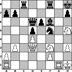 Partie-Notation im PGN-Format [Event "Bremer Schl"] [Site "www.mySchach.de"] [Date "2008.11.01"] [Round "2"] [White "martinus"] [Black "muetoe"] [ECO "B12"] [WhitemyELO "1928"] [BlackmyELO "1940"] [Result "1/2-1/2"] [TimeControl "10/2592000"] [WhiteDays "65"] [BlackDays "79"] [MySchachNr "49450"] 1. e4 c6 2. d4 d5 3. e5 Bf5 4. Nf3 e6 5. Bd3 Ne7 6. Nc3 Nd7 7. O-O Bxd3 8. Qxd3 Nf5 9. Ne2 Be7 10. b3 Rc8 11. c4 O-O 12. Bf4 g5 13. g4 Nh6 14. Bd2 Nxg4 15. cxd5 cxd5 16. h3 Nh6 17. Kh1 Nf5 18. Bxg5 Kh8 19. Rg1 f6 20. exf6 Nxf6 21. Bxf6+ Bxf6 22. Nf4 Qd6 23. Nh5 1/2-1/2 Stellungs-Notation im FEN-Format 2r2r1k/pp5p/3qpb2/3p1n1N/3P4/1P1Q1N1P/P4P2/R5RK - - - 3 23 Geschlagene Figuren Weiss: Geschlagene Figuren Schwarz: Klicken Sie auf eine geschlagene Figur um den gewünschten Zug darzustellen!