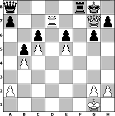 Partie-Notation im PGN-Format [Event "1.Schaltjahresturnier@mySchach"] [Site "www.mySchach.de"] [Date "2004.02.29"] [Round "1"] [White "kalle"] [Black "dennis2004"] [ECO "D10"] [WhitemyELO "1681"] [BlackmyELO "1510"] [Result "1-0"] [TimeControl "10/1728000"] [WhiteDays "68"] [BlackDays "48"] [MySchachNr "2579"] 1. d4 d5 2. c4 c6 3. Nc3 Nf6 4. Nf3 Bg4 5. Ne5 Nbd7 6. Nxg4 Nxg4 7. e4 Nxf2 8. Kxf2 dxe4 9. Nxe4 g6 10. Be2 Bg7 11. Rf1 O-O 12. Kg1 Nb6 13. Be3 Nd7 14. Qc2 Nf6 15. Nxf6+ Bxf6 16. Bh6 Re8 17. Rad1 Qc7 18. Bf4 Qb6 19. c5 Qd8 20. Be5 Bxe5 21. dxe5 Qc7 22. Bc4 e6 23. Rd6 Re7 24. b4 Rd8 25. Qd2 Red7 26. Qe3 b6 27. Rfd1 Rxd6 28. Rxd6 b5 29. Qd4 Re8 30. Rd7 Qb8 31. Bb3 Qa8 32. Qd6 Rc8 33. Qe7 Rf8 34. Bxe6 fxe6 35. Qg7# 1-0 Stellungs-Notation im FEN-Format q4rk1/p2R2Qp/2p1p1p1/1pP1P3/1P6/8/P5PP/6K1 - - - 1 35 Geschlagene Figuren Weiss: ![]() ![]() ![]() ![]() ![]() ![]() ![]() ![]() ![]() ![]() ![]() ![]() ![]() ![]() ![]() Geschlagene Figuren Schwarz: ![]() ![]() ![]() ![]() ![]() ![]() ![]() ![]() ![]() ![]() ![]() ![]() ![]() ![]() ![]() Klicken Sie auf eine geschlagene Figur um den gewünschten Zug darzustellen!