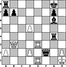 Partie-Notation im PGN-Format [Event "33 1/3"] [Site "www.mySchach.de"] [Date "2009.06.02"] [Round "2"] [White "werderfan"] [Black "murphy12"] [ECO "A85"] [WhitemyELO "1534"] [BlackmyELO "1632"] [Result "0-1"] [TimeControl "10/864000"] [WhiteDays "10"] [BlackDays "10"] [MySchachNr "56287"] 1. d4 f5 2. c4 Nf6 3. Nc3 e6 4. Bg5 Be7 5. e3 O-O 6. Nf3 Ne4 7. Bxe7 Qxe7 8. Qc2 d5 9. cxd5 Nxc3 10. bxc3 exd5 11. Bd3 c5 12. c4 Nc6 13. cxd5 Nb4 14. Qb3 Nxd3+ 15. Qxd3 cxd4 16. Qxd4 f4 17. O-O Bg4 18. Ne5 Bh5 19. exf4 Rf6 20. g4 Be8 21. g5 Rb6 22. Rfe1 Qa3 23. Re3 Qf8 24. Rae1 Rb4 25. Qd3 Rxf4 26. g6 hxg6 27. Nxg6 Rg4+ 28. Kh1 Bxg6 29. Qb3 Qxf2 0-1 Stellungs-Notation im FEN-Format r5k1/pp4p1/6b1/3P4/6r1/1Q2R3/P2P1q1P/4R2K - - - 0 30 Geschlagene Figuren Weiss: ![]() ![]() ![]() ![]() ![]() ![]() ![]() ![]() ![]() ![]() ![]() ![]() ![]() ![]() ![]() Geschlagene Figuren Schwarz: ![]() ![]() ![]() ![]() ![]() ![]() ![]() ![]() ![]() ![]() ![]() ![]() ![]() ![]() ![]() Klicken Sie auf eine geschlagene Figur um den gewünschten Zug darzustellen!