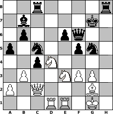 Partie-Notation im PGN-Format [Event "Bremer Schl"] [Site "www.mySchach.de"] [Date "2008.11.01"] [Round "2"] [White "Phantasos"] [Black "deepsabel"] [ECO "D00"] [WhitemyELO "2124"] [BlackmyELO "1924"] [Result "0-1"] [TimeControl "10/2592000"] [WhiteDays "00"] [BlackDays "98"] [MySchachNr "49429"] 1. d4 d5 2. Bf4 Nf6 3. e3 c5 4. c3 e6 5. Nf3 Bd6 6. dxc5 Bxf4 7. exf4 O-O 8. Nbd2 Qc7 9. g3 Nbd7 10. Be2 Nxc5 11. O-O b6 12. Rc1 Bb7 13. Qc2 Rac8 14. Rfe1 Rfd8 15. Nb3 Nfe4 16. Bf1 h6 17. Nbd4 g5 18. fxg5 hxg5 19. Nb5 Qe7 20. Ne5 a6 21. Nd4 f6 22. Ng4 f5 23. Ne3 g4 24. h3 gxh3 25. Bxh3 Qf6 26. f3 Ng5 27. Bg2 a5 28. Rcd1 Kg7 29. b3 Rh8 30. c4 dxc4 0-1 Stellungs-Notation im FEN-Format 2r4r/1b4k1/1p2pq2/p1n2pn1/2pN4/1P2NPP1/P1Q3B1/3RR1K1 - - - 0 31 Geschlagene Figuren Weiss: Geschlagene Figuren Schwarz: Klicken Sie auf eine geschlagene Figur um den gewünschten Zug darzustellen!