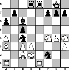 Partie-Notation im PGN-Format [Event "Bobby Fischer Ged"] [Site "www.mySchach.de"] [Date "2008.02.01"] [Round "1"] [White "jlarue700"] [Black "dbuse"] [ECO "B20"] [WhitemyELO "1472"] [BlackmyELO "1580"] [Result "0-1"] [TimeControl "10/864000"] [WhiteDays "20"] [BlackDays "30"] [MySchachNr "42199"] 1. e4 c5 2. Bc4 e6 3. Nf3 a6 4. a4 Nc6 5. Nc3 Nf6 6. d3 d5 7. exd5 exd5 8. Ba2 Qe7+ 9. Qe2 Nb4 10. Qxe7+ Bxe7 11. Kd2 O-O 12. h3 Bf5 13. Bb1 d4 14. Ne2 Bd6 15. c3 dxc3+ 16. bxc3 Nc6 17. Rd1 Rfe8 18. Ba3 Rad8 19. g4 Na5 20. Bc2 Bd7 21. Re1 Bc6 22. Nh4 Ne4+ 23. Kd1 Nxf2+ 24. Kd2 Bf4+ 25. Nxf4 Nc4+ 0-1 Stellungs-Notation im FEN-Format 3rr1k1/1p3ppp/p1b5/2p5/P1n2NPN/B1PP3P/2BK1n2/R3R3 - - - 1 26 Geschlagene Figuren Weiss: Geschlagene Figuren Schwarz: Klicken Sie auf eine geschlagene Figur um den gewünschten Zug darzustellen!