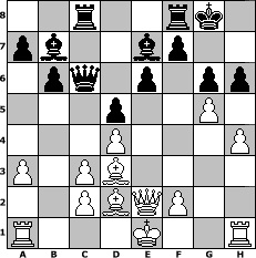 Partie-Notation im PGN-Format [Event "Vogelwild"] [Site "www.mySchach.de"] [Date "2009.06.13"] [Round "1"] [White "rikilatic"] [Black "Steffi"] [ECO "D00"] [WhitemyELO "1451"] [BlackmyELO "1487"] [Result "0-1"] [TimeControl "10/864000"] [WhiteDays "00"] [BlackDays "13"] [MySchachNr "56578"] 1. d4 d5 2. e3 Nf6 3. Nc3 e6 4. Bb5+ c6 5. Bd3 Be7 6. Nf3 O-O 7. Ng5 h6 8. h4 Nbd7 9. a3 b6 10. Nf3 c5 11. Ne5 cxd4 12. Nxd7 Qxd7 13. exd4 Bb7 14. g4 Ne4 15. Qe2 Nxc3 16. bxc3 Rac8 17. g5 Qc6 18. Bd2 g6 0-1 Stellungs-Notation im FEN-Format 2r2rk1/pb2bp2/1pq1p1pp/3p2P1/3P3P/P1PB4/2PBQP2/R3K2R - KQ - 0 19 Geschlagene Figuren Weiss: Geschlagene Figuren Schwarz: Klicken Sie auf eine geschlagene Figur um den gewünschten Zug darzustellen!