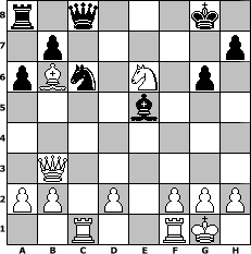 Partie-Notation im PGN-Format [Event "Winter 19/20"] [Site "www.mySchach.de"] [Date "2020.01.09"] [Round "2"] [White "HPB2005"] [Black "hape50"] [ECO "D31"] [WhitemyELO "1901"] [BlackmyELO "1266"] [Result "1-0"] [TimeControl "10/2592000"] [WhiteDays "74"] [BlackDays "78"] [MySchachNr "116918"] 1. d4 d5 2. c4 e6 3. Nc3 g6 4. Qb3 Bg7 5. Nf3 a6 6. cxd5 exd5 7. Qxd5 Nd7 8. e4 Ne7 9. Qb3 Nc6 10. Be3 Nb6 11. d5 Na7 12. Bg5 Qd7 13. Rc1 O-O 14. Be3 Qd6 15. Be2 Bd7 16. e5 Qe7 17. d6 Qd8 18. dxc7 Qxc7 19. Bxb6 Qc8 20. O-O Nc6 21. Ne4 Re8 22. Neg5 Re7 23. Bc4 Be6 24. Nxe6 fxe6 25. Ng5 Bxe5 26. Bxe6+ Rxe6 27. Nxe6 1-0 Stellungs-Notation im FEN-Format r1q3k1/1p5p/pBn1N1p1/4b3/8/1Q6/PP1P1PPP/2R2RK1 - - - 0 27 Geschlagene Figuren Weiss: Geschlagene Figuren Schwarz: Klicken Sie auf eine geschlagene Figur um den gewünschten Zug darzustellen!