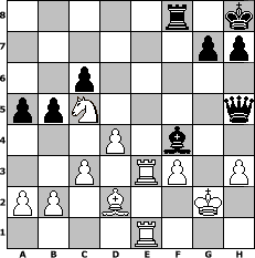 Partie-Notation im PGN-Format [Event "Ranglistenturnier DWZ 1800 bis 2380 Gr.A"] [Site "www.mySchach.de"] [Date "2015.03.09"] [Round "1"] [White "Grubengeist"] [Black "jeremyt"] [ECO "C89"] [WhitemyELO "1896"] [BlackmyELO "2074"] [Result "0-1"] [TimeControl "10/2592000"] [WhiteDays "30"] [BlackDays "30"] [MySchachNr "98465"] 1. e4 e5 2. Nf3 Nc6 3. Bb5 a6 4. Ba4 Nf6 5. O-O Be7 6. Re1 b5 7. Bb3 O-O 8. c3 d5 9. exd5 Nxd5 10. Nxe5 Nxe5 11. Rxe5 c6 12. d4 Bd6 13. Re1 Qh4 14. g3 Qh3 15. Qe2 Bg4 16. Qf1 Qh5 17. Nd2 f5 18. f3 Bh3 19. Qf2 Kh8 20. Nf1 f4 21. Bxd5 fxg3 22. Nxg3 Qxd5 23. Ne4 Rae8 24. Bd2 Re6 25. Re3 Rg6+ 26. Kh1 Rg2 27. Qxg2 Bxg2+ 28. Kxg2 a5 29. Rae1 Bc7 30. Nc5 Qh5 31. h3 Bf4 0-1 Stellungs-Notation im FEN-Format 5r1k/6pp/2p5/ppN4q/3P1b2/2P1RP1P/PP1B2K1/4R3 - - - 1 32 Geschlagene Figuren Weiss: Geschlagene Figuren Schwarz: Klicken Sie auf eine geschlagene Figur um den gewünschten Zug darzustellen!
