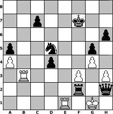 Partie-Notation im PGN-Format [Event "Frühling 2023"] [Site "www.mySchach.de"] [Date "2023.05.22"] [Round "2"] [White "Achimkogge"] [Black "Leon"] [ECO "D00"] [WhitemyELO "1274"] [BlackmyELO "1738"] [Result "0-1"] [TimeControl "10/1728000"] [WhiteDays "096"] [BlackDays "100"] [MySchachNr "130004"] 1. d4 d5 2. c3 Nc6 3. Nf3 Bg4 4. Ng5 h6 5. Nf3 Nf6 6. Nh4 e5 7. h3 Be6 8. Be3 e4 9. Qa4 Bd7 10. Qb3 Na5 11. Qd1 g5 12. Nf3 exf3 13. exf3 Bd6 14. g4 Qe7 15. Bd3 Bf4 16. O-O Bxe3 17. Kg2 Bf4 18. Re1 Be6 19. Qa4+ Nc6 20. Bb5 Qd6 21. Re2 Bc1 22. Nd2 Bxb2 23. Rb1 Bxc3 24. Nb3 O-O 25. Nc5 Nxd4 26. Nxb7 Qf4 27. Re3 Bd2 28. Rd3 Nxb5 29. Qxb5 d4 30. Rd1 Bc3 31. Nc5 Rab8 32. Qa4 a5 33. Nxe6 fxe6 34. Qc4 Nd5 35. a4 Rb2 36. Kg1 Re2 37. Qc6 Be1 38. Rb3 Rxf2 39. Qxe6+ Kg7 40. Qd7+ Rf7 41. Qxf7+ Kxf7 42. Rxe1 Qh2# 0-1 Stellungs-Notation im FEN-Format 8/2p2k2/7p/p2n2p1/P2p2P1/1R3P1P/5r1q/4R1K1 - - - 1 43 Geschlagene Figuren Weiss: Geschlagene Figuren Schwarz: Klicken Sie auf eine geschlagene Figur um den gewünschten Zug darzustellen!