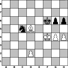 Partie-Notation im PGN-Format [Event "Herbstturnier bis 1600"] [Site "www.mySchach.de"] [Date "2025.10.14"] [Round "1"] [White "skuehnel"] [Black "Winston"] [ECO "D20"] [WhitemyELO "1373"] [BlackmyELO "1536"] [Result "1/2-1/2"] [TimeControl "10/2592000"] [WhiteDays "132"] [BlackDays "150"] [MySchachNr "133759"] 1. d4 d5 2. c4 dxc4 3. e4 b5 4. a4 c6 5. axb5 cxb5 6. Nc3 a6 7. Nxb5 Bd7 8. Bxc4 e6 9. d5 e5 10. Nf3 Bg4 11. d6 Bxf3 12. Qxf3 Nf6 13. Bg5 Nbd7 14. Bd5 Rb8 15. Nc7+ Qxc7 16. dxc7 Rc8 17. Qc3 Bc5 18. Qa5 O-O 19. O-O Bb6 20. Qc3 Rxc7 21. Qb4 Rb8 22. Rxa6 Bxf2+ 23. Rxf2 Rxb4 24. Bc6 h6 25. Be3 Nxe4 26. Re2 Nec5 27. Bxc5 Nxc5 28. Ra8+ Kh7 29. Be8 e4 30. Rd8 Re7 31. Bc6 e3 32. Re8 Rxe8 33. Bxe8 f5 34. Rxe3 Rxb2 35. Rf3 g6 36. g4 Rb8 37. Bc6 Rc8 38. Bd5 Rf8 39. h3 Kg7 40. Kg2 Rf6 41. Kg3 f4+ 42. Rxf4 Rxf4 43. Kxf4 Kf6 44. h4 1/2-1/2 Stellungs-Notation im FEN-Format 8/8/5kpp/2nB4/5KPP/8/3P4/8 - - - 0 44 Geschlagene Figuren Weiss: Geschlagene Figuren Schwarz: Klicken Sie auf eine geschlagene Figur um den gewünschten Zug darzustellen!