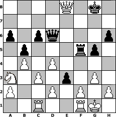 Partie-Notation im PGN-Format [Event "Thera"] [Site "www.mySchach.de"] [Date "2025.07.03"] [Round "1"] [White "Achimkogge"] [Black "Hobbykegler"] [ECO "D00"] [WhitemyELO "1221"] [BlackmyELO "1036"] [Result "1-0"] [TimeControl "10/2592000"] [WhiteDays "114"] [BlackDays "089"] [MySchachNr "133482"] 1. d4 d5 2. c3 Nc6 3. Nf3 Nf6 4. Ng5 Bf5 5. Na3 h6 6. Nf3 Qd6 7. Nb5 Qd7 8. Bf4 a6 9. Na3 b5 10. b4 e6 11. Nh4 g5 12. Nxf5 exf5 13. e3 Bd6 14. Bxd6 Qxd6 15. Bd3 O-O 16. Bxf5 Rae8 17. Qd3 Ne7 18. Bh3 Ne4 19. Bg4 f5 20. Bh5 Rc8 21. O-O f4 22. Bg4 Nf5 23. Bxf5 fxe3 24. Bxe4 dxe4 25. Qxe3 Rce8 26. Rac1 c6 27. g3 Rf3 28. Qe2 Rf5 29. Qh5 e3 30. Qxe8+ 1-0 Stellungs-Notation im FEN-Format 4Q1k1/8/p1pq3p/1p3rp1/1P1P4/N1P1p1P1/P2P1P1P/2R2RK1 - - - 0 30 Geschlagene Figuren Weiss: Geschlagene Figuren Schwarz: Klicken Sie auf eine geschlagene Figur um den gewünschten Zug darzustellen!